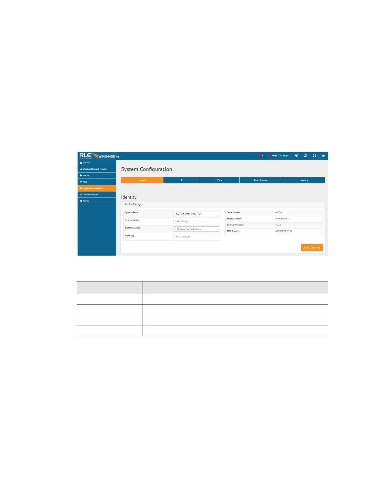 The Identity page allows you to customize the name of the WiNG-MGR and the contact and