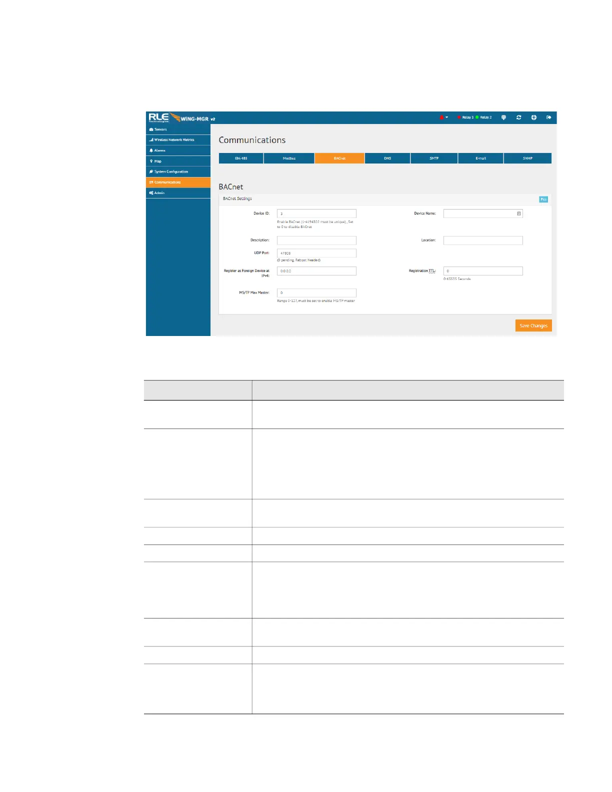 If the WiNG-MGR will communicate via the BACnet, configure the necessary options here.