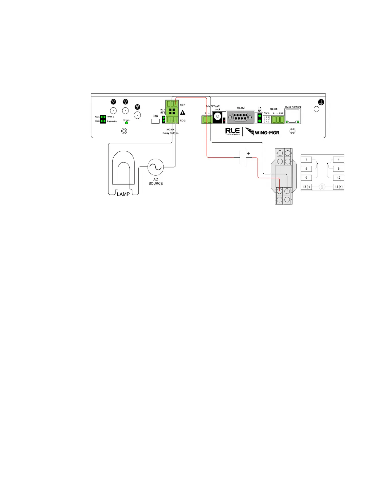 The WiNG-MGR accommodates two wired relay outputs. Any relay output connections must