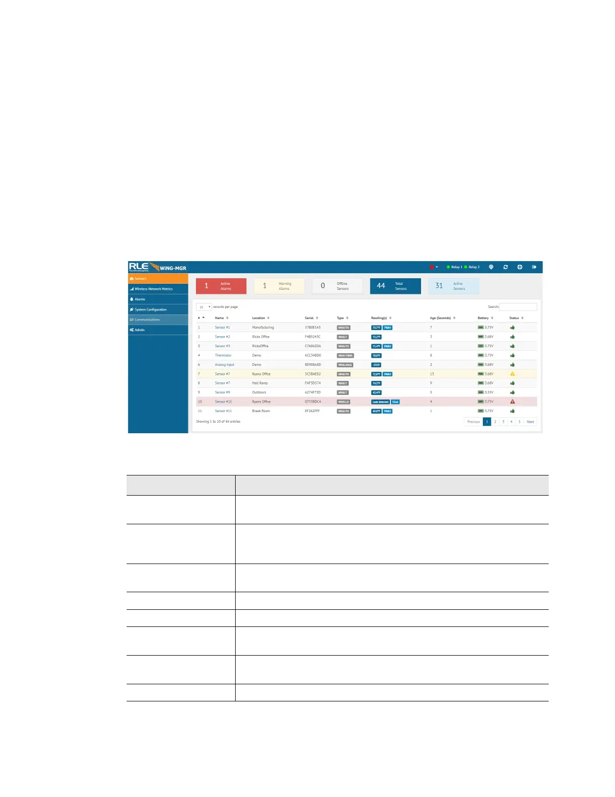 The Sensors page allows users to view all the sensors accessible through the WiNG-MGR and