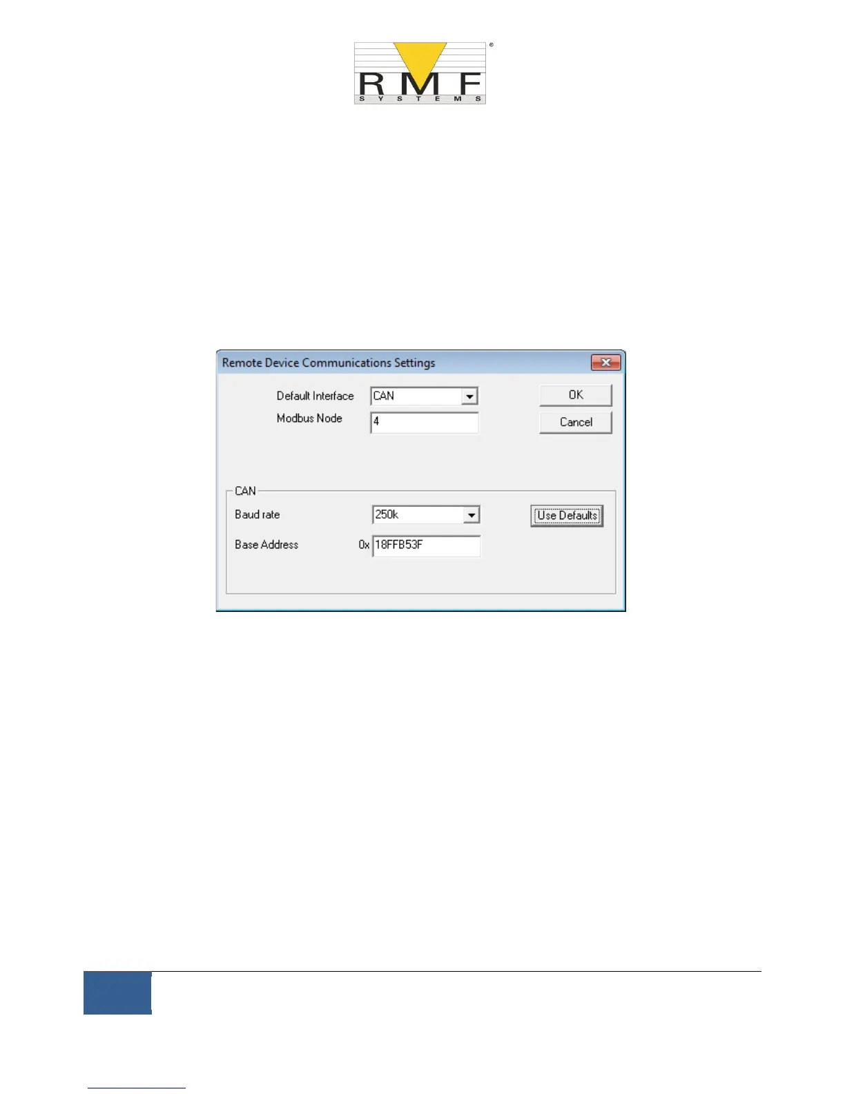 The CAN-bus parameters are configured from the Communication Settings dialogue, accessed from the CMS