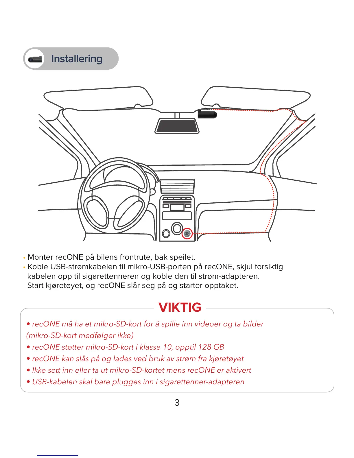 • Monter recONE på bilens frontrute, bak speilet.