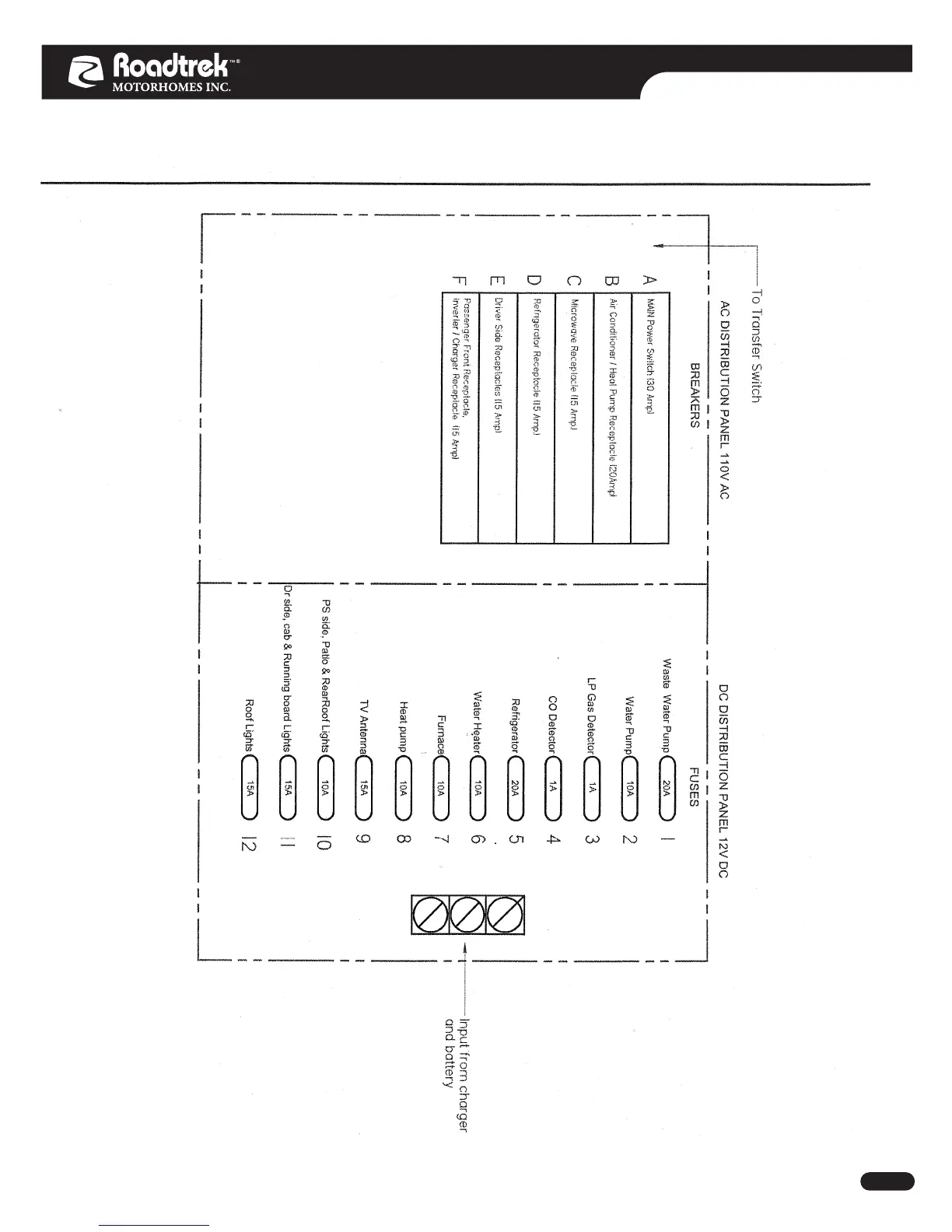 Roadtrek 170 - Electrical Distribution Panels; AC Distribution Panel (110 V AC Breakers); DC Distribution Panel (12 V DC Fuses)
