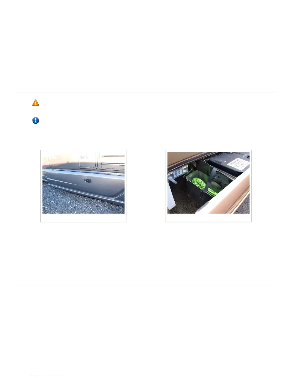 •• Open the big access door of the storage drawer the driver`s side. This will expose the waste water discharge hose and