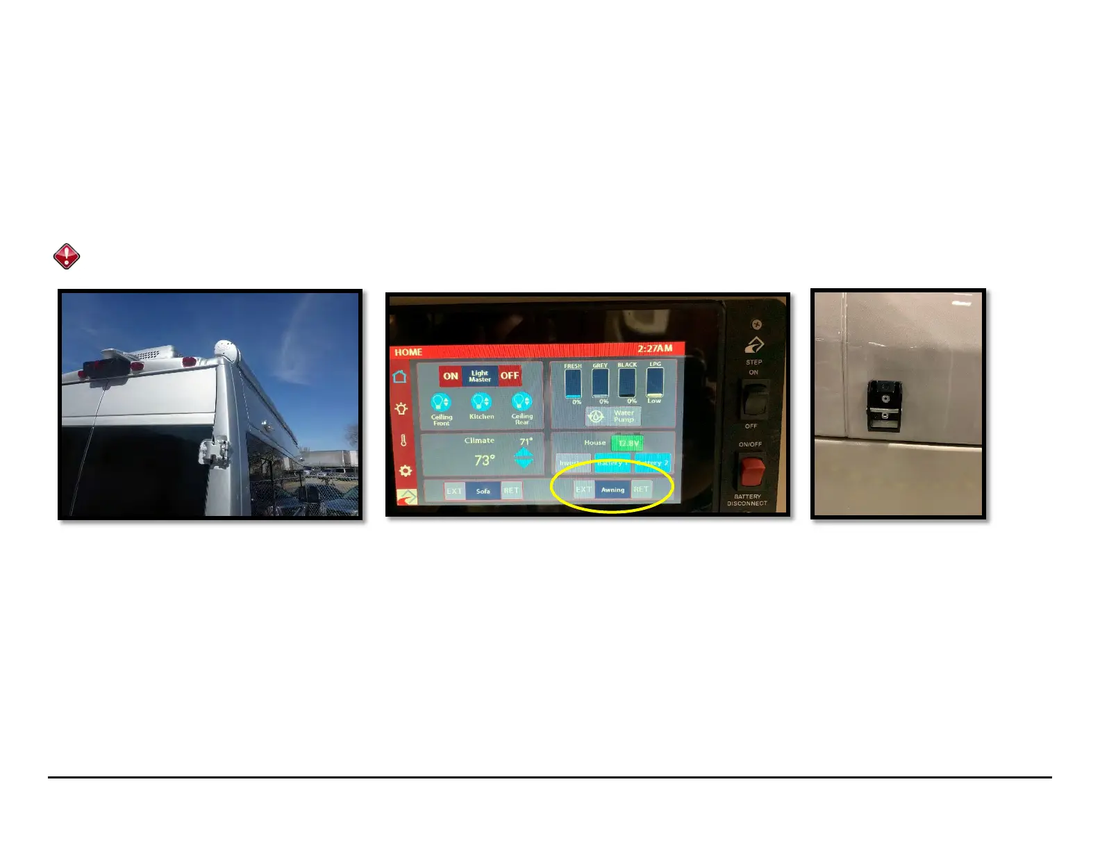 Your Roadtrek has a roll up awning. (Picture 30.1) The awning is controlled by the Firefly interface, simply press the touch screen switch to