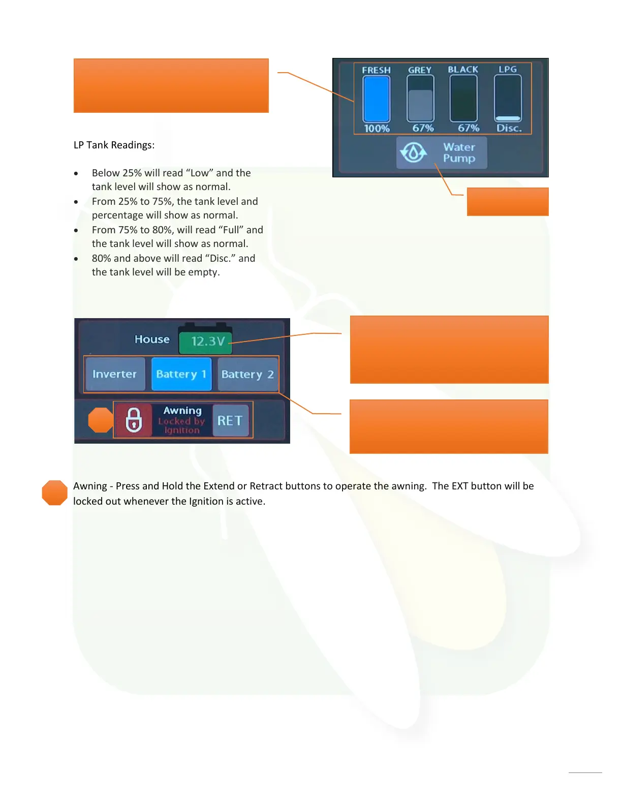 Awning - Press and Hold the Extend or Retract buttons to operate the awning. The EXT button will be