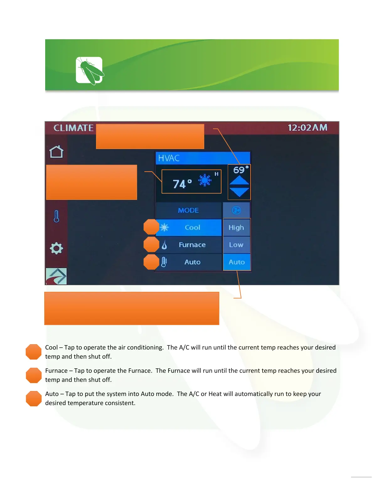 Cool Tap to operate the air conditioning. The A/C will run until the current temp reaches your desired