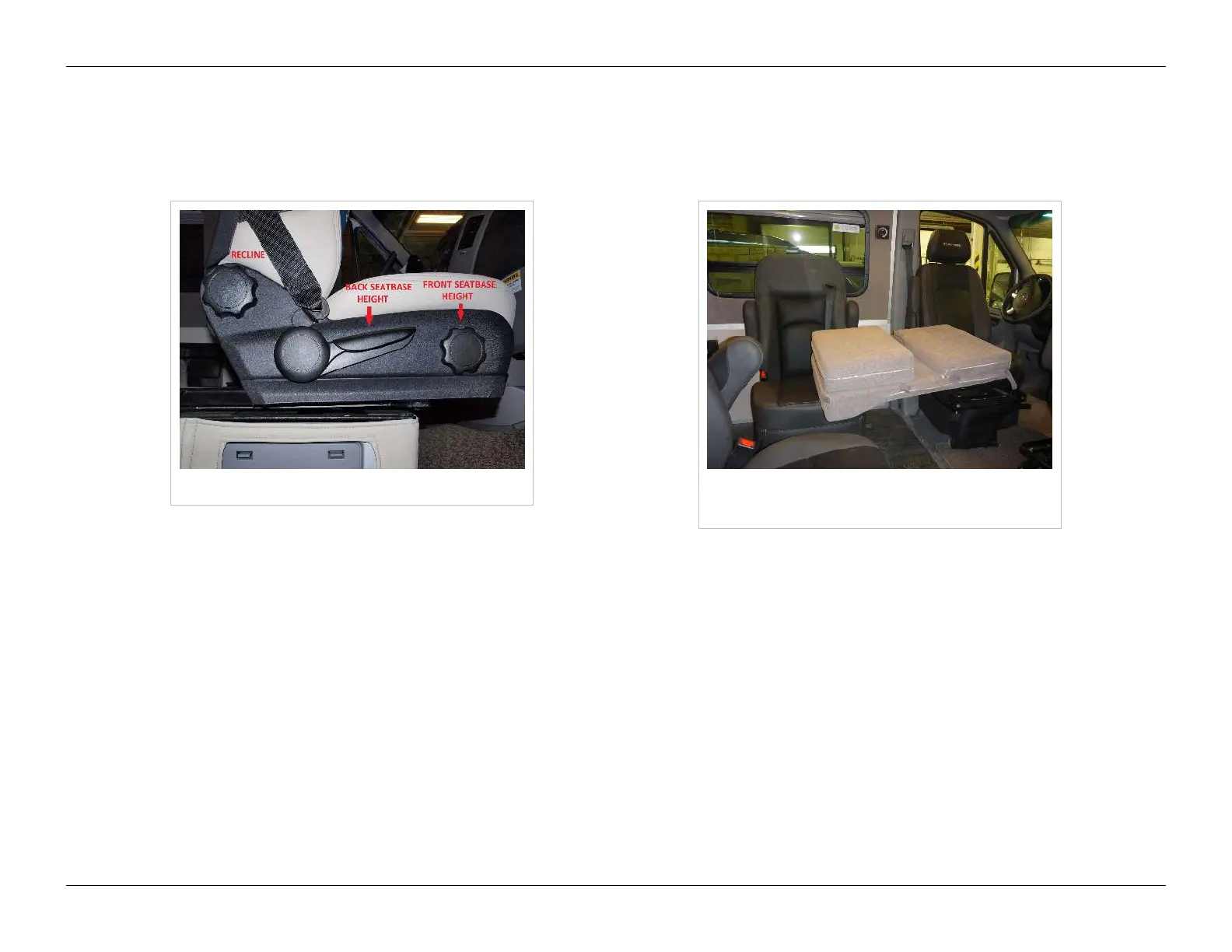 The captain seats located on the passenger side of the vehicle can be configured into a single bed arrangement with the
