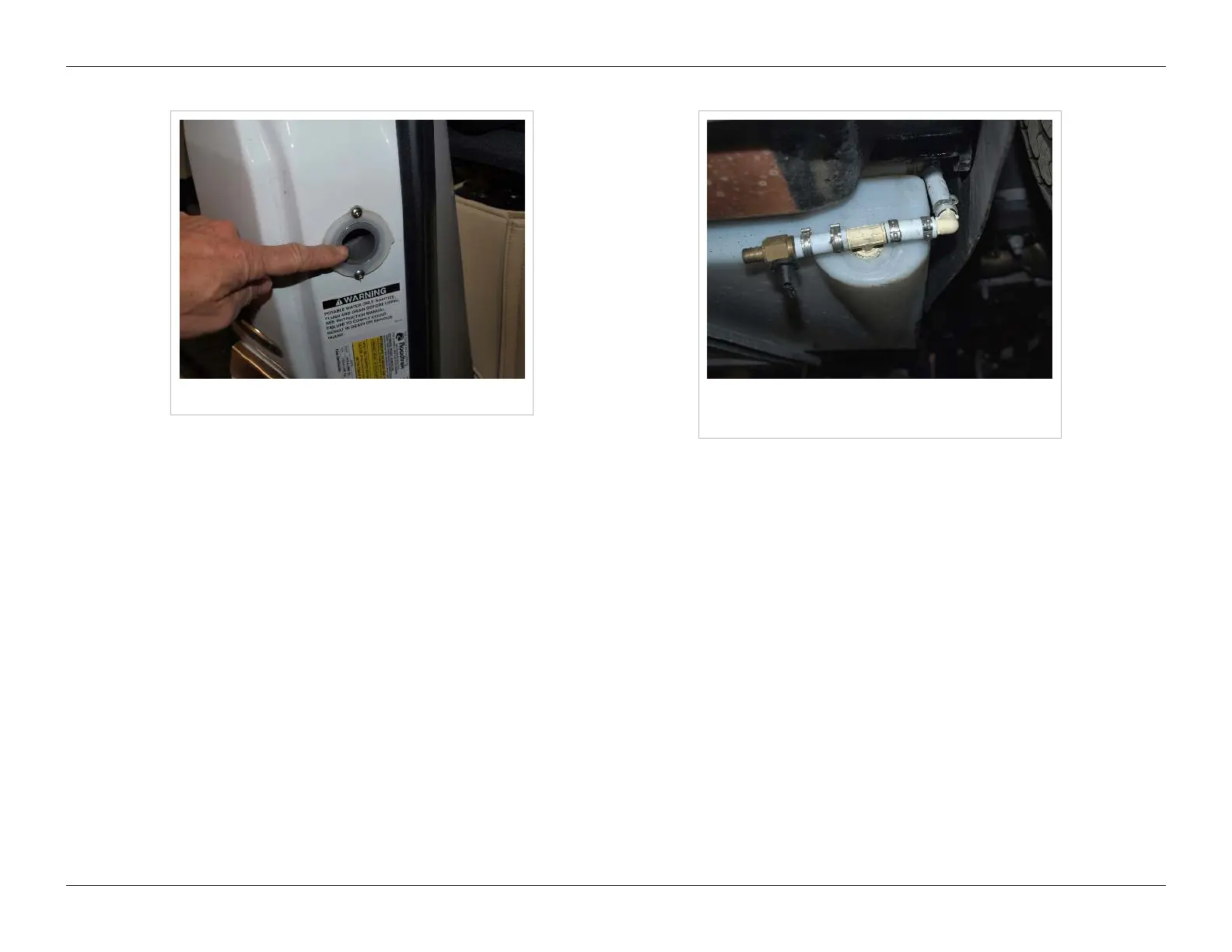 Gravity fill on passenger doorframe Drain for freshwater tank, beneath