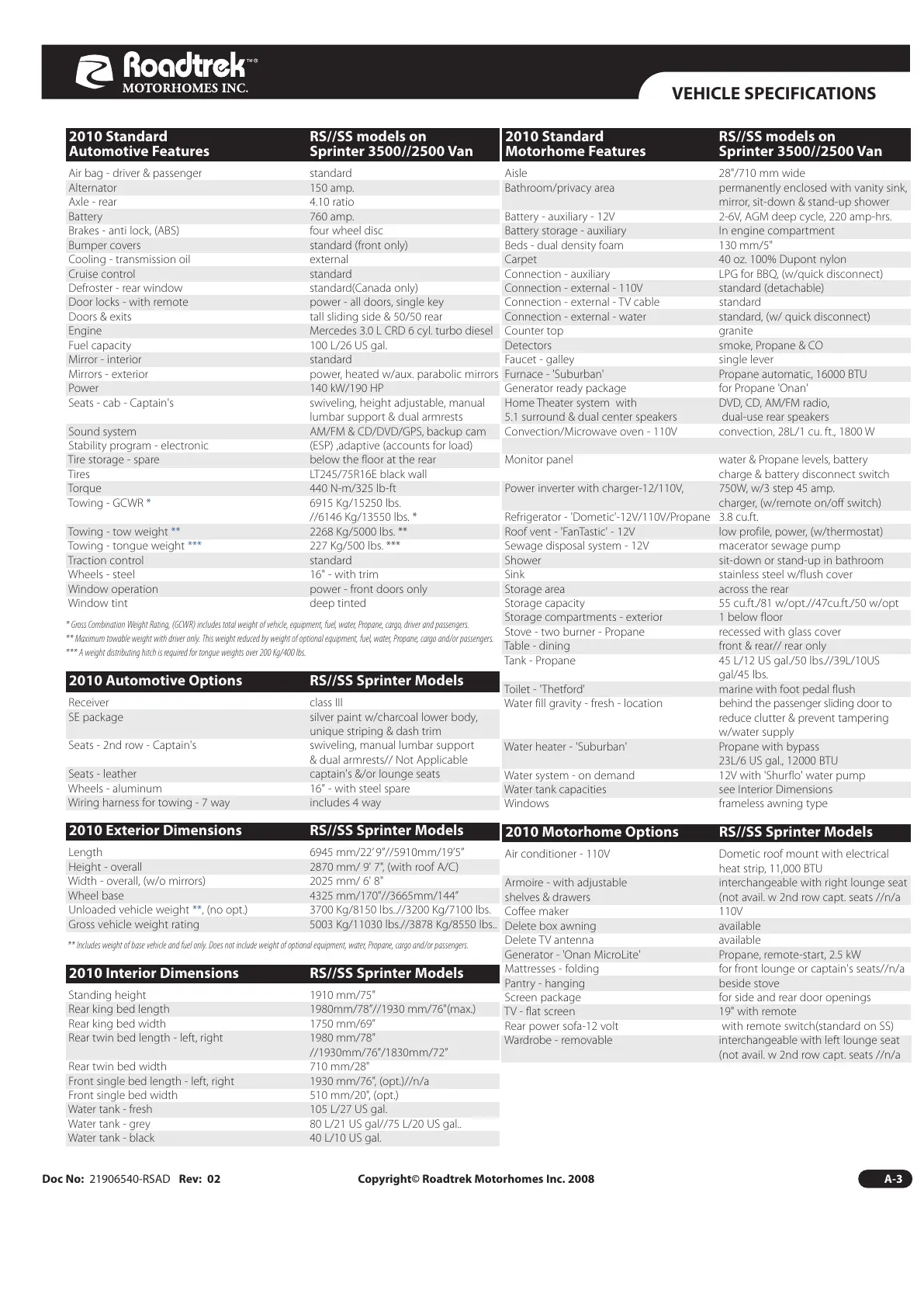 Doc No: 21906540-RSAD Rev: 02 Copyright© Roadtrek Motorhomes Inc. 2008 A-3
