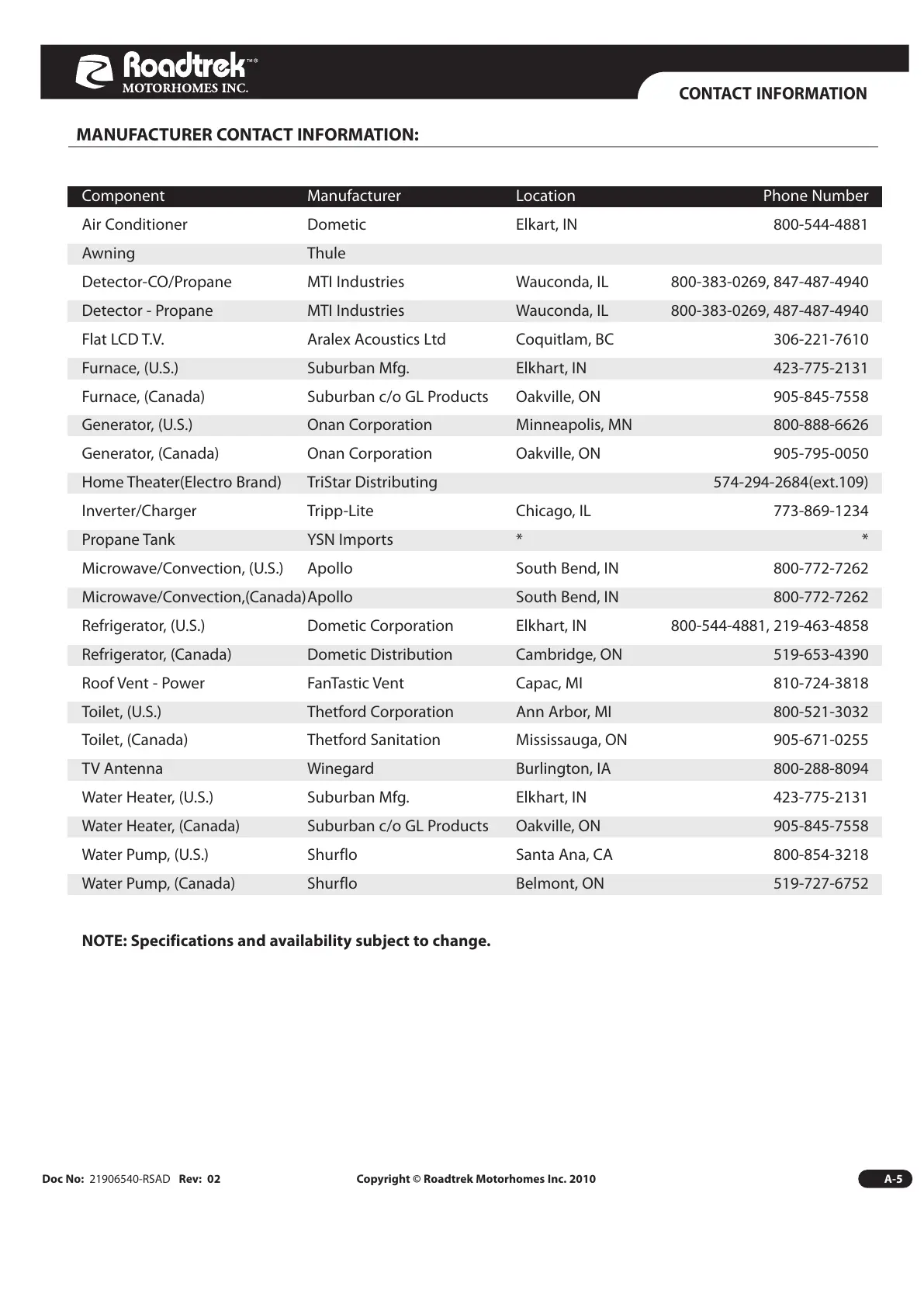 Doc No: 21906540-RSAD Rev: 02 Copyright © Roadtrek Motorhomes Inc. 2010 A-5