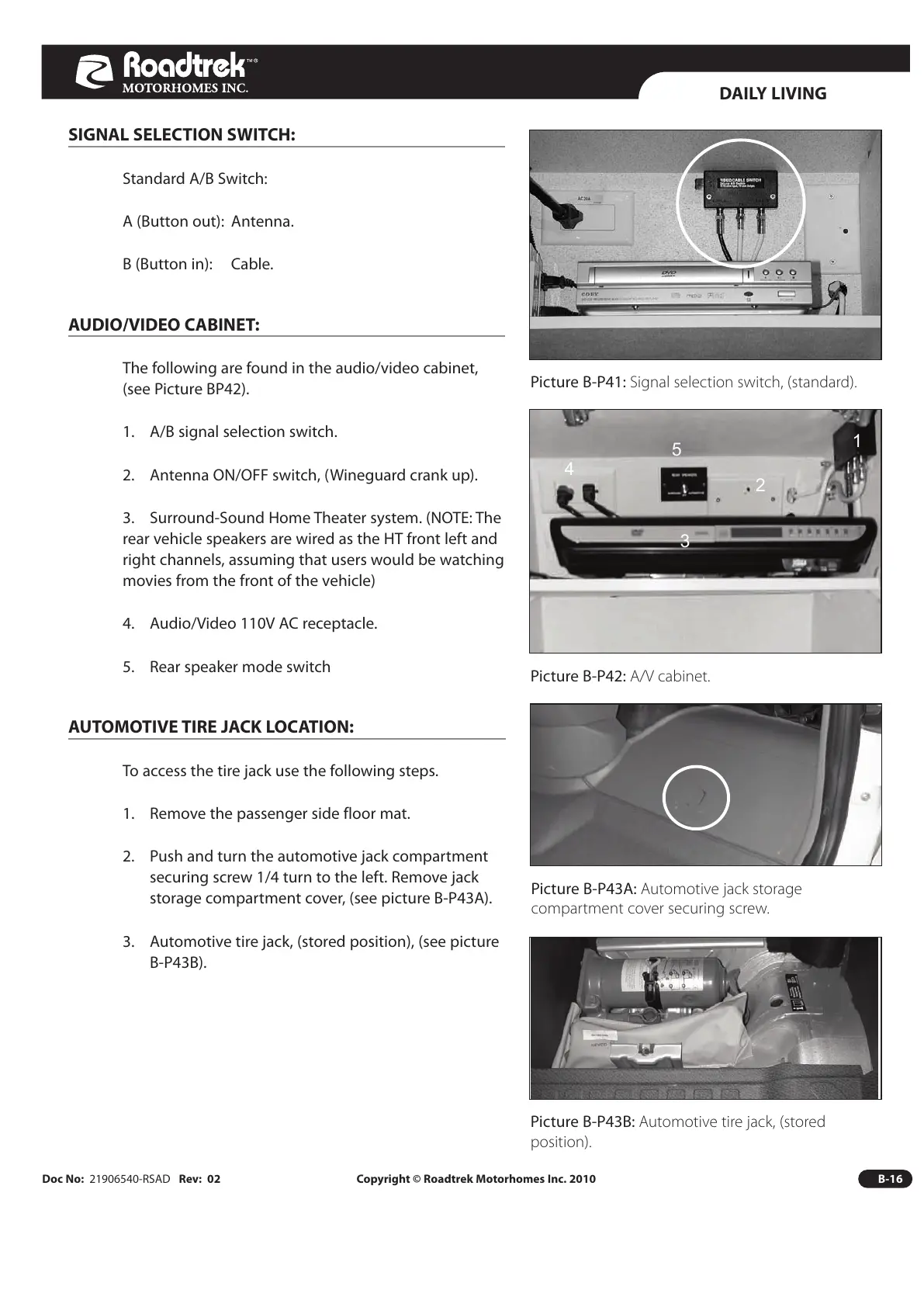 Doc No: 21906540-RSAD Rev: 02 Copyright © Roadtrek Motorhomes Inc. 2010 B-16