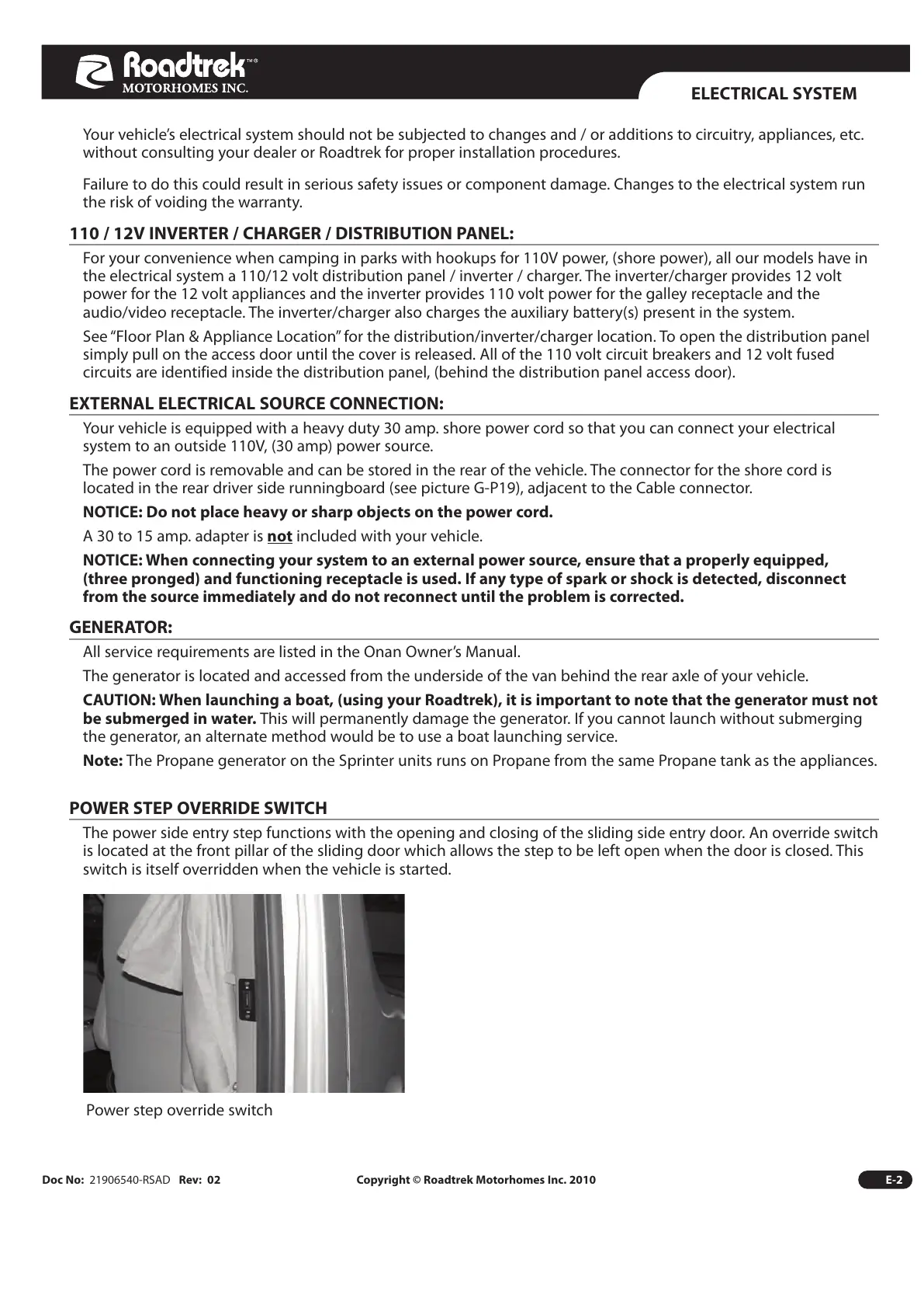 Doc No: 21906540-RSAD Rev: 02 Copyright © Roadtrek Motorhomes Inc. 2010 E-2