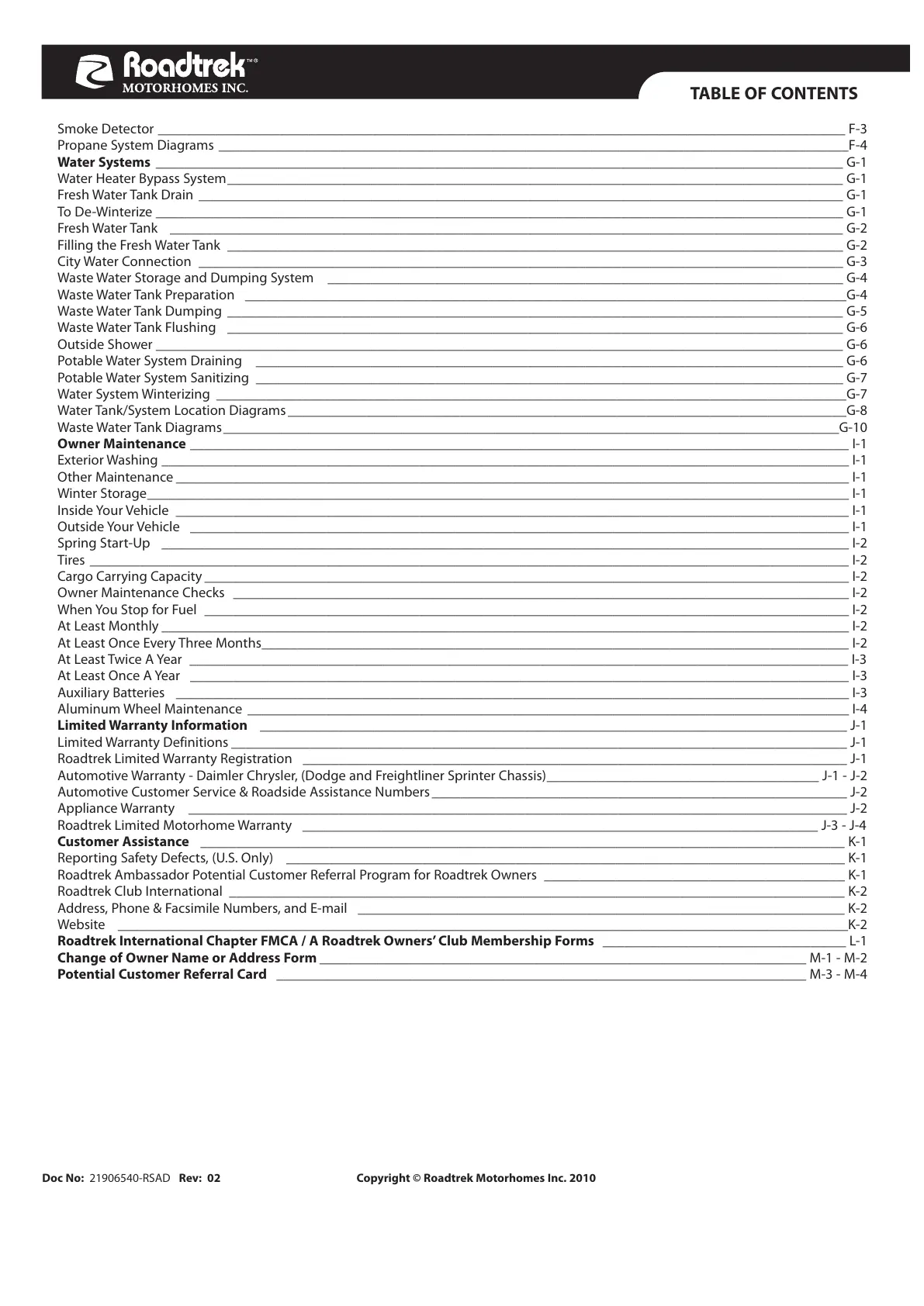 Doc No: 21906540-RSAD Rev: 02 Copyright © Roadtrek Motorhomes Inc. 2010 B - 1