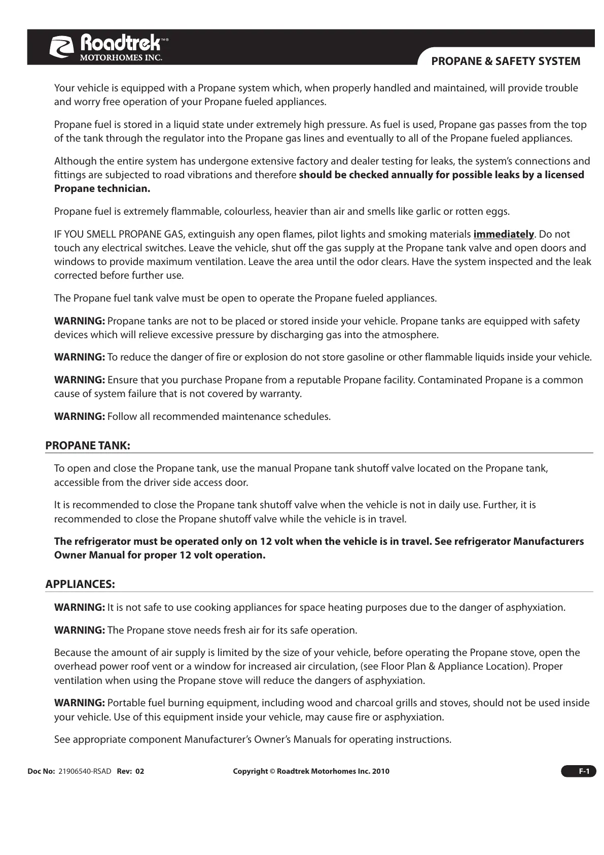 Doc No: 21906540-RSAD Rev: 02 Copyright © Roadtrek Motorhomes Inc. 2010 F-1