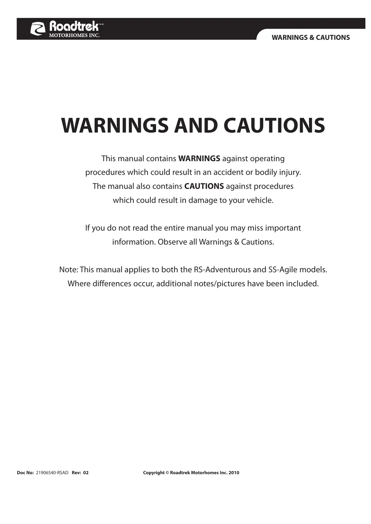 Doc No: 21906540-RSAD Rev: 02 Copyright © Roadtrek Motorhomes Inc. 2010