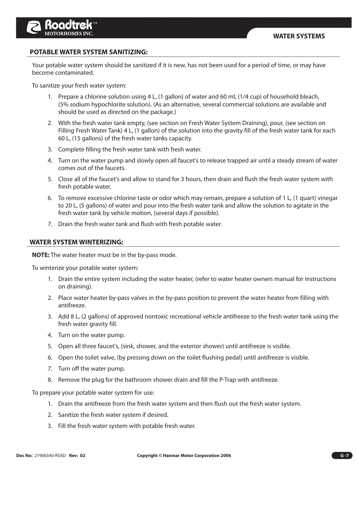 5. Close all of the faucet's and allow to stand for 3 hours, then drain and flush the fresh water system with