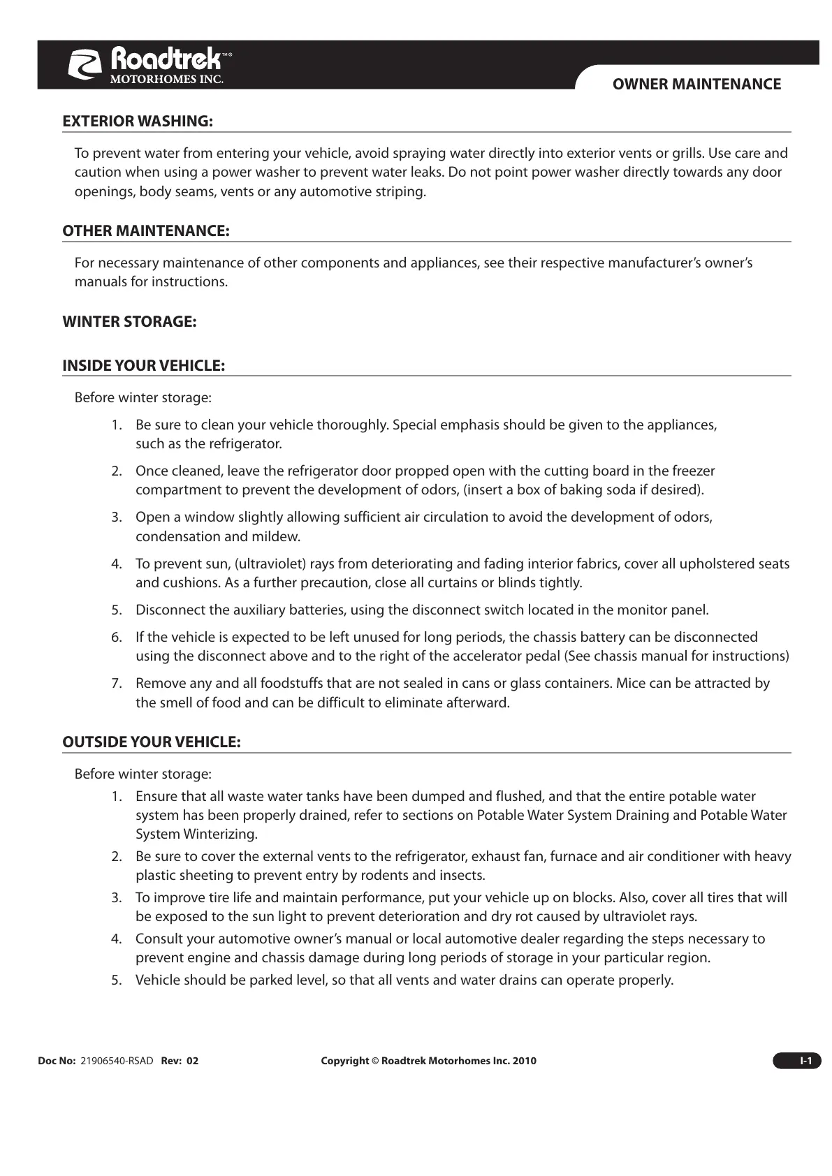 Doc No: 21906540-RSAD Rev: 02 Copyright © Roadtrek Motorhomes Inc. 2010 I-1
