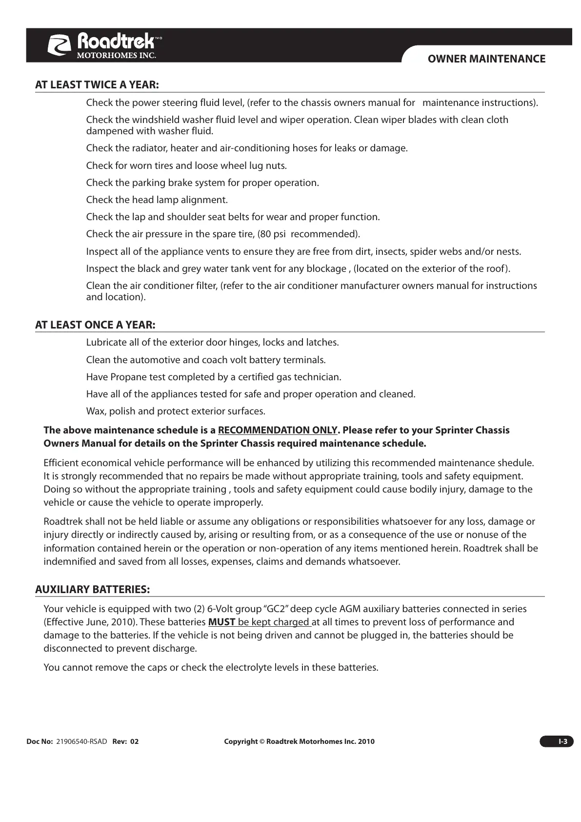 Doc No: 21906540-RSAD Rev: 02 Copyright © Roadtrek Motorhomes Inc. 2010 I-3