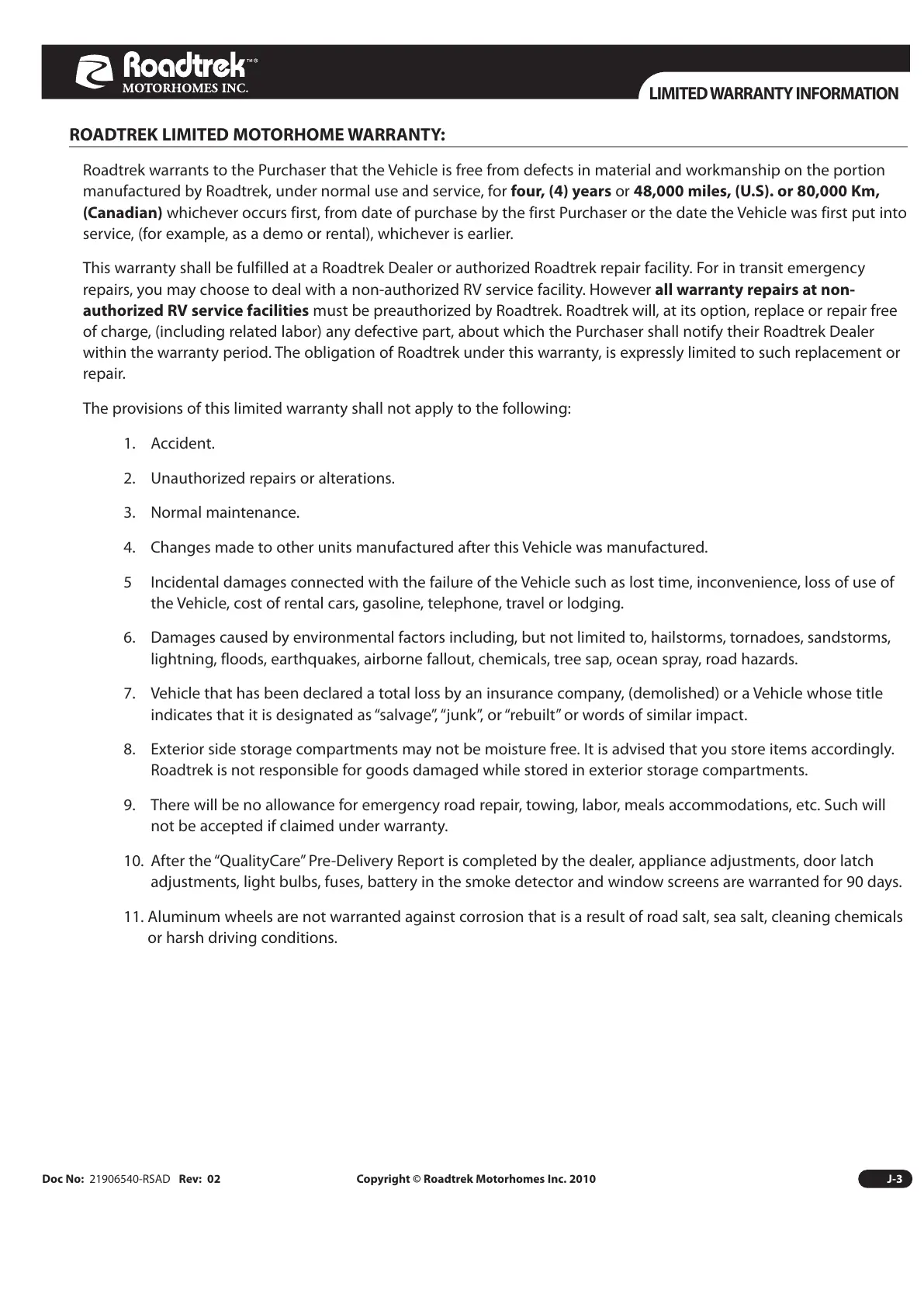 Doc No: 21906540-RSAD Rev: 02 Copyright © Roadtrek Motorhomes Inc. 2010 J-3