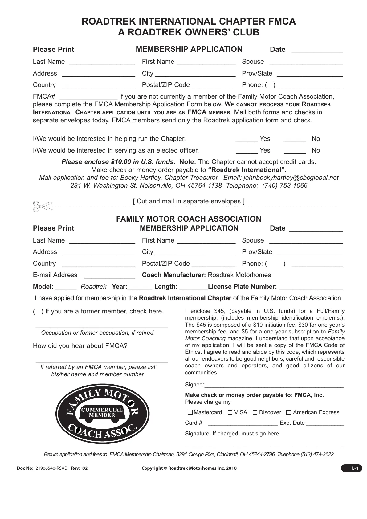 separate envelopes today. FMCA members send only the Roadtrek application form and check.