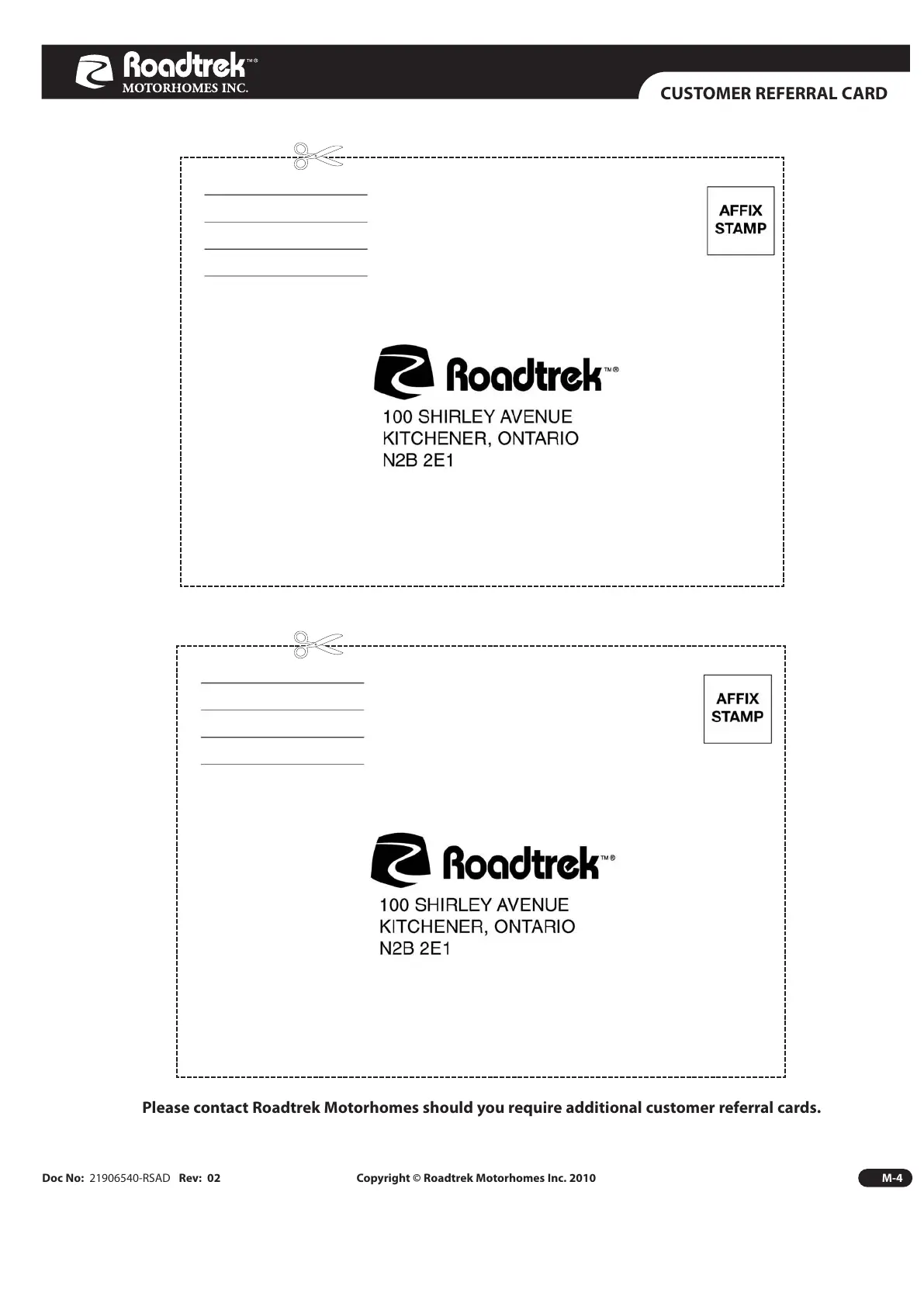 Please contact Roadtrek Motorhomes should you require additional customer referral cards.