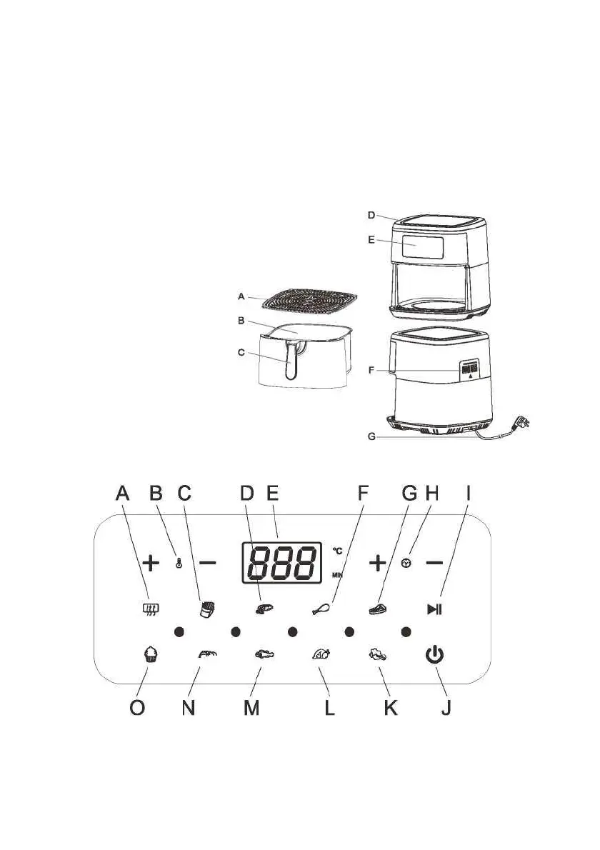Temperatura F: Coscia di pollo G: Bistecca H: Tempo +/- I: PAUSA