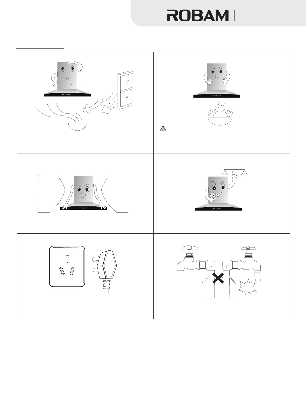 ●Don' t install the hood on wood and other combustible walls. The wall shall be made of noncombustible