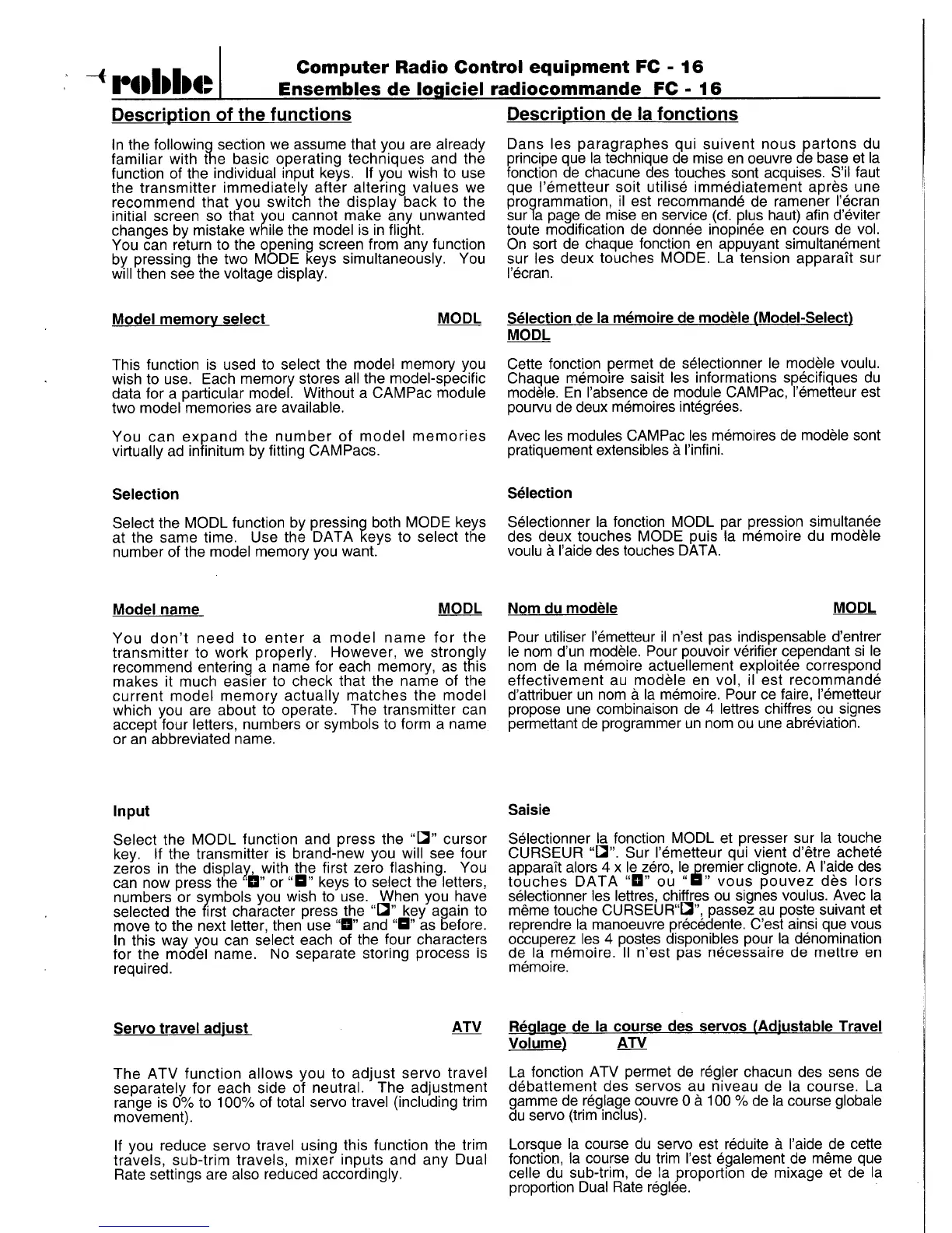 ROBBE-Futaba FC-16 - Description of the Functions; Model Memory Select; Selection; Model Name