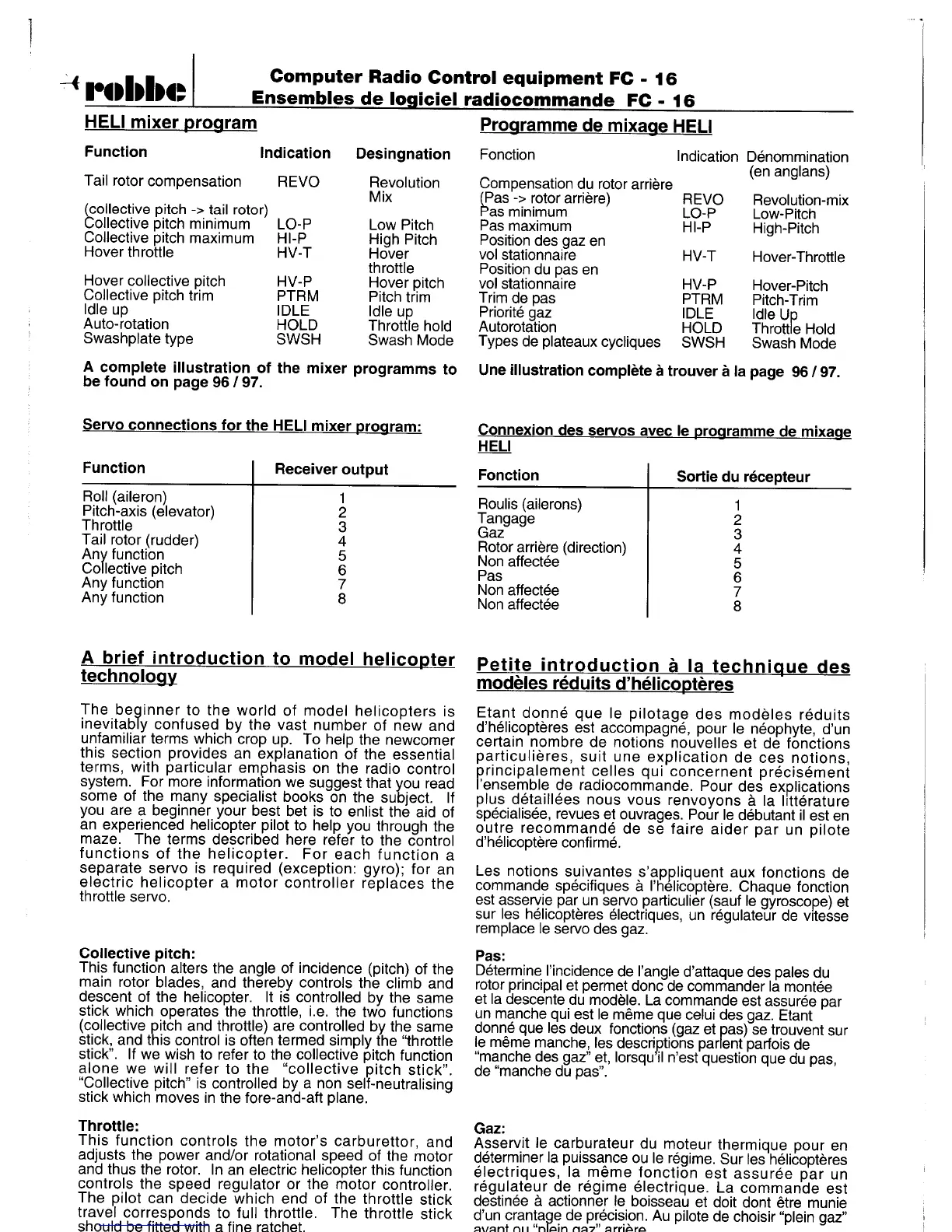 ROBBE-Futaba FC-16 - HELI Mixer Program; A Bried Introduction to Model Helicopter Technology; Servo Connections for the HELI Mixer Program; Collective Pitch
