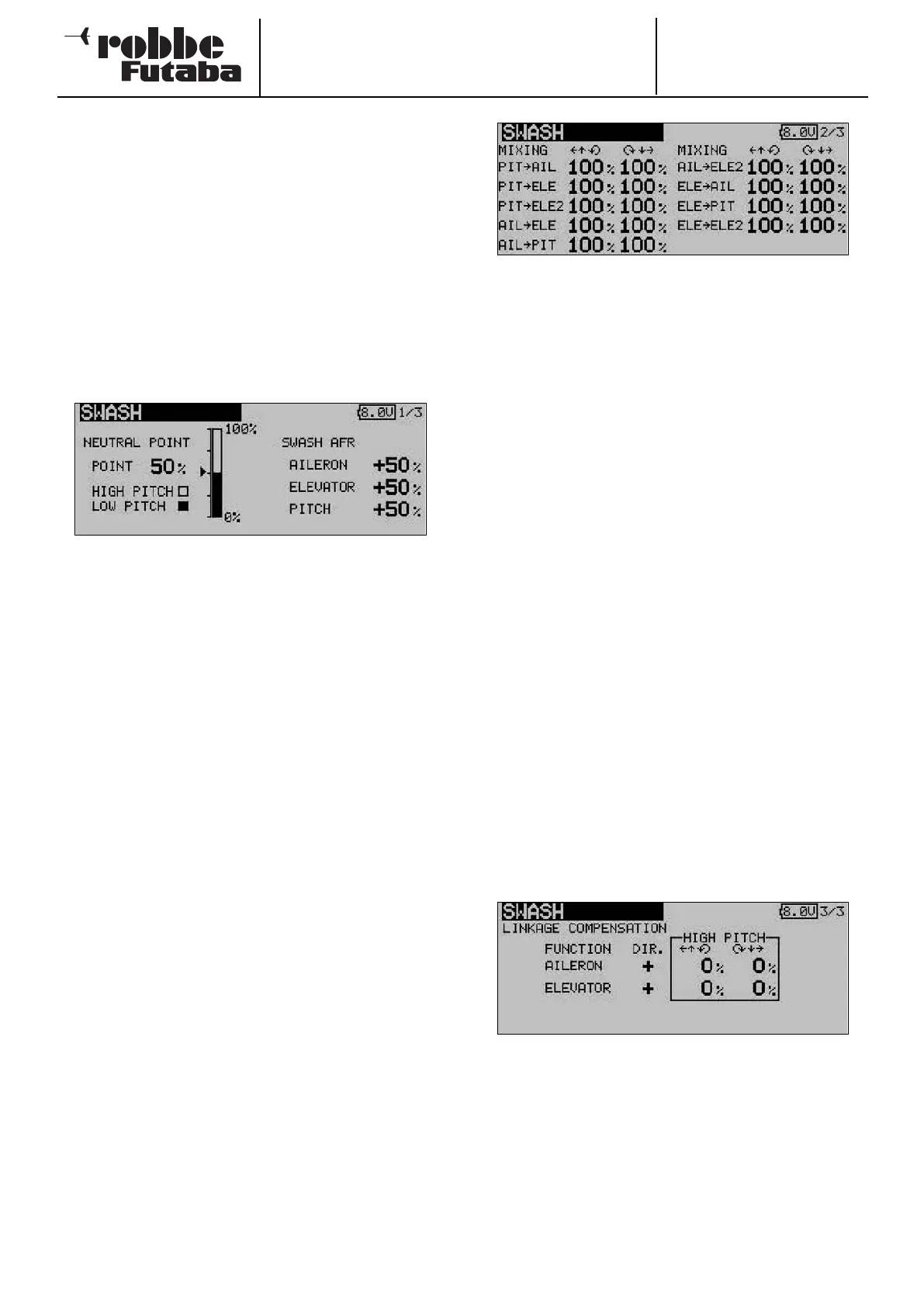 The swashplate menu has several display levels (pages); the