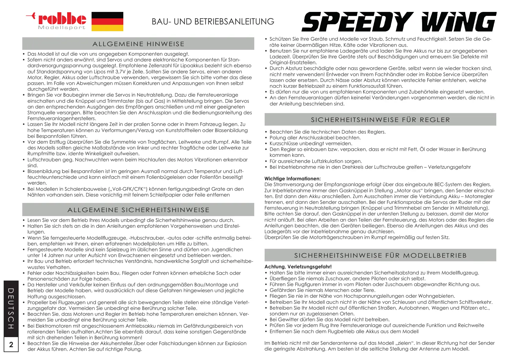 • Lesen Sie vor dem Betrieb Ihres Modells unbedingt die Sicherheitshinweise genau durch.