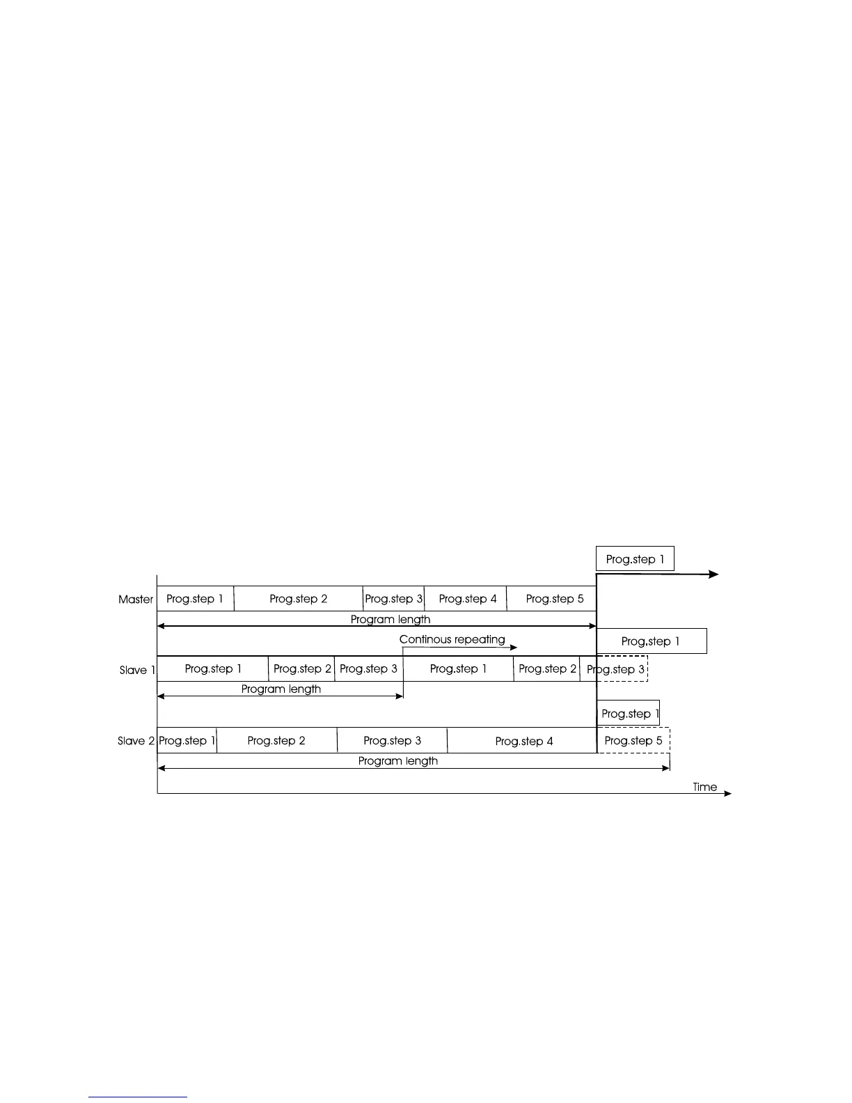 If the slave fixture has a longer program length, it will restart at prog. step 1 before it completes all its prog.steps
