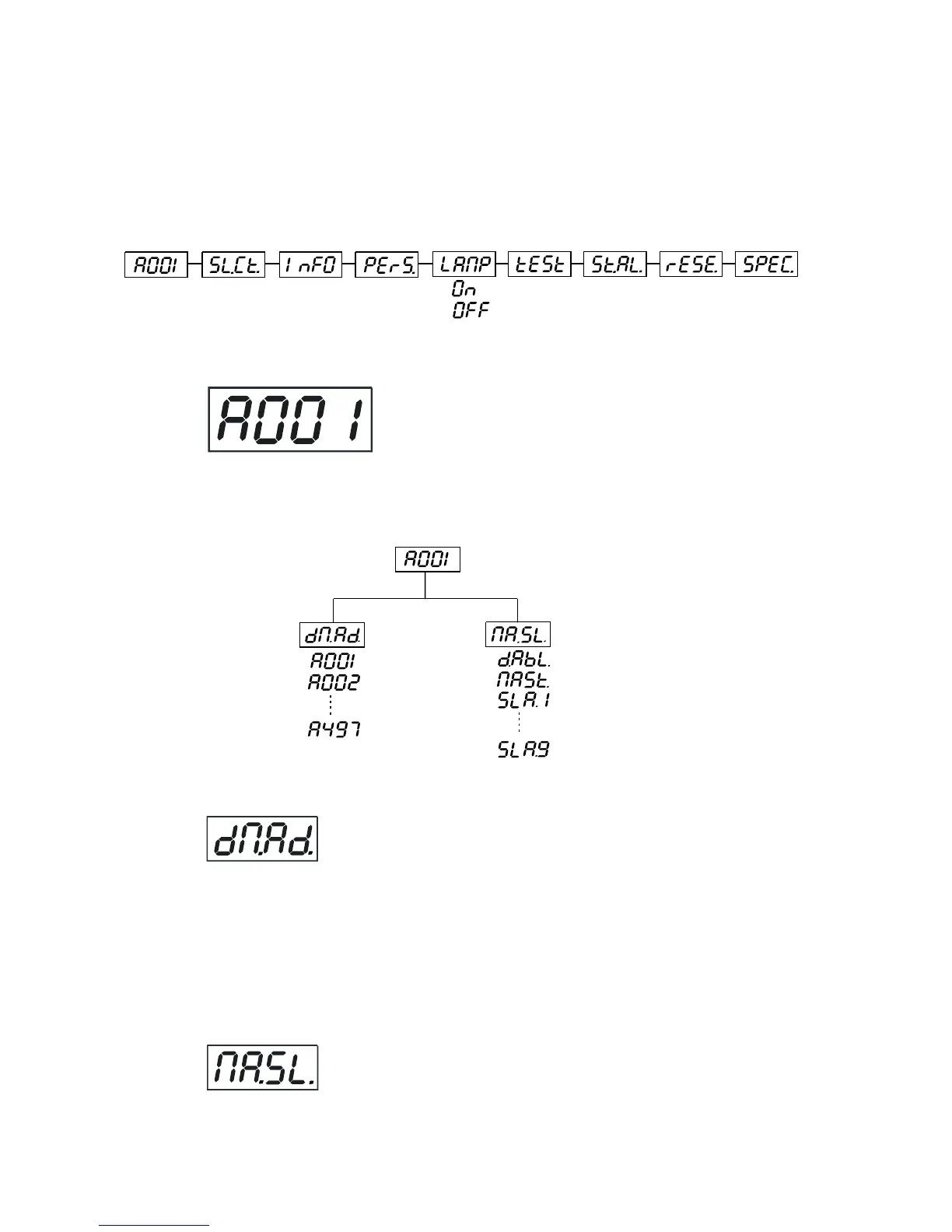 until the display shows message "A001" (with actually stored address). Browse through the menu by the pressing