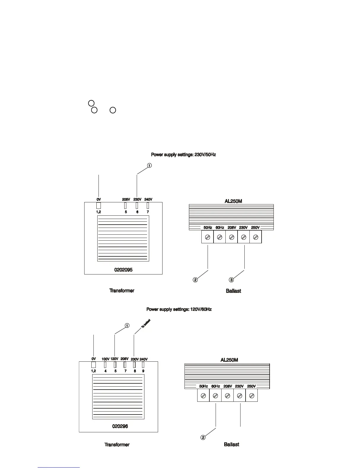 Both the transformer and the ballast must be connected correctly for the local AC voltage and frequency.