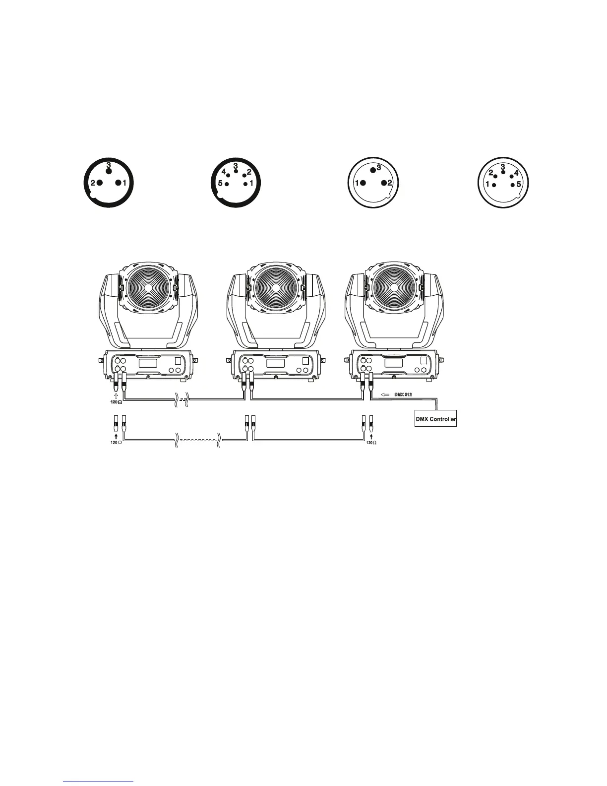 The xture is equipped with both 3-pin and 5-pin XLR sockets for DMX input and output.The sockets are wired