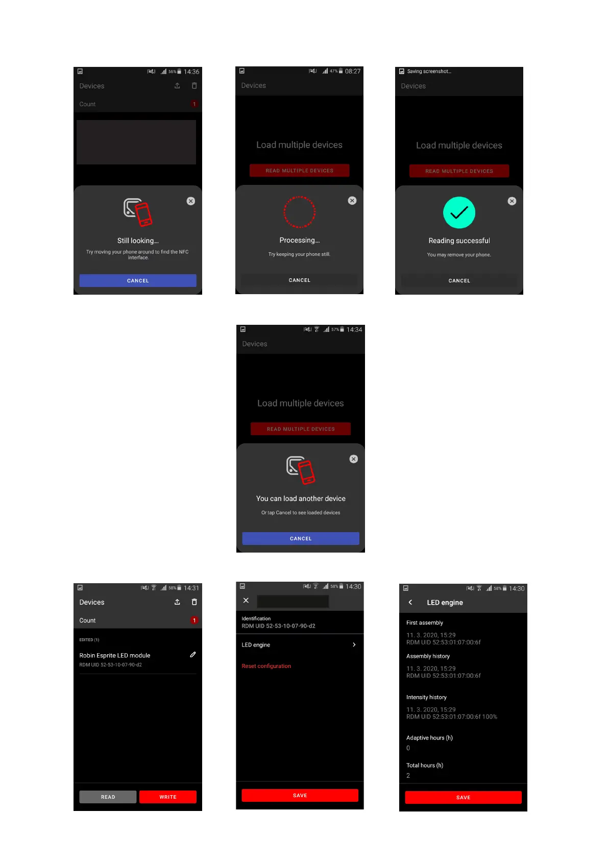 If NFC connection is OK, the screen with RDM UID of the LED light source will appear.