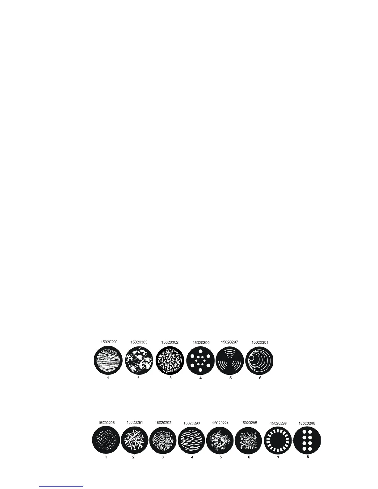 Glass gobos: outside diameter=30.8 mm, image diameter=25 mm, max. thickness=3.5 mm, high