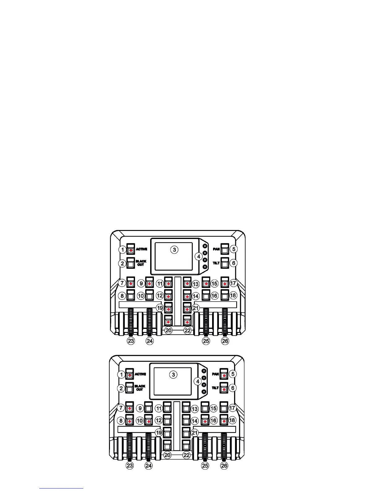 wheels activating buttons (8/9/16/18) and the pan/tilt buttons (5/6) start to ash.
