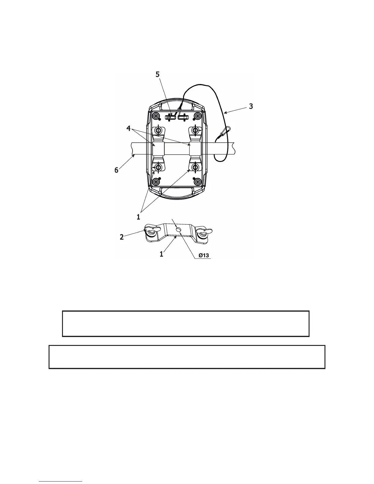 3. Fasten the safety cable in the attachment point (5) and around the truss (6) as shown on the picture below.