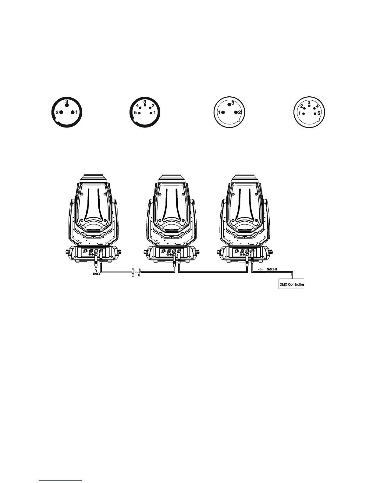 The xture is equipped with both 3-pin and 5-pin XLR sockets for DMX input and output.The sockets are wired