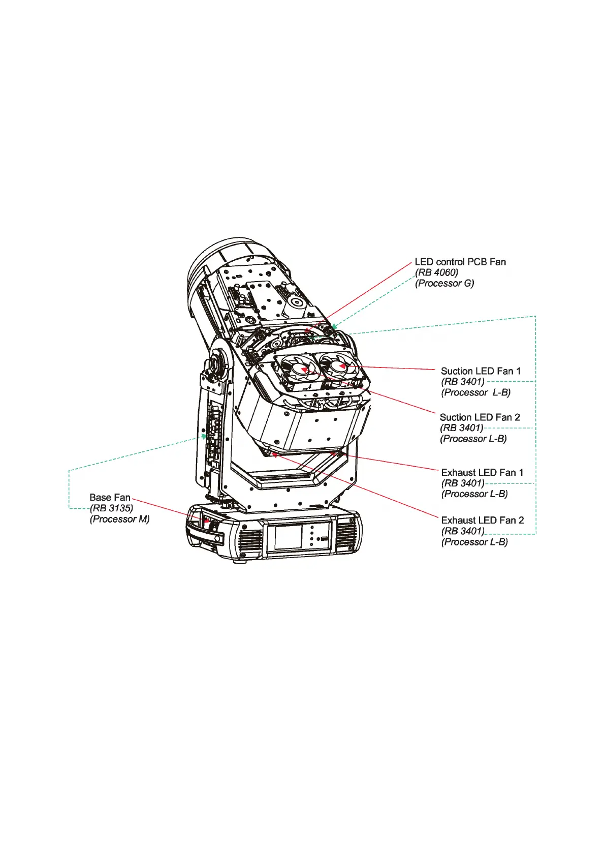 The fan in the xture base is disconnected from its control PCB or is faulty and should be replaced. A light