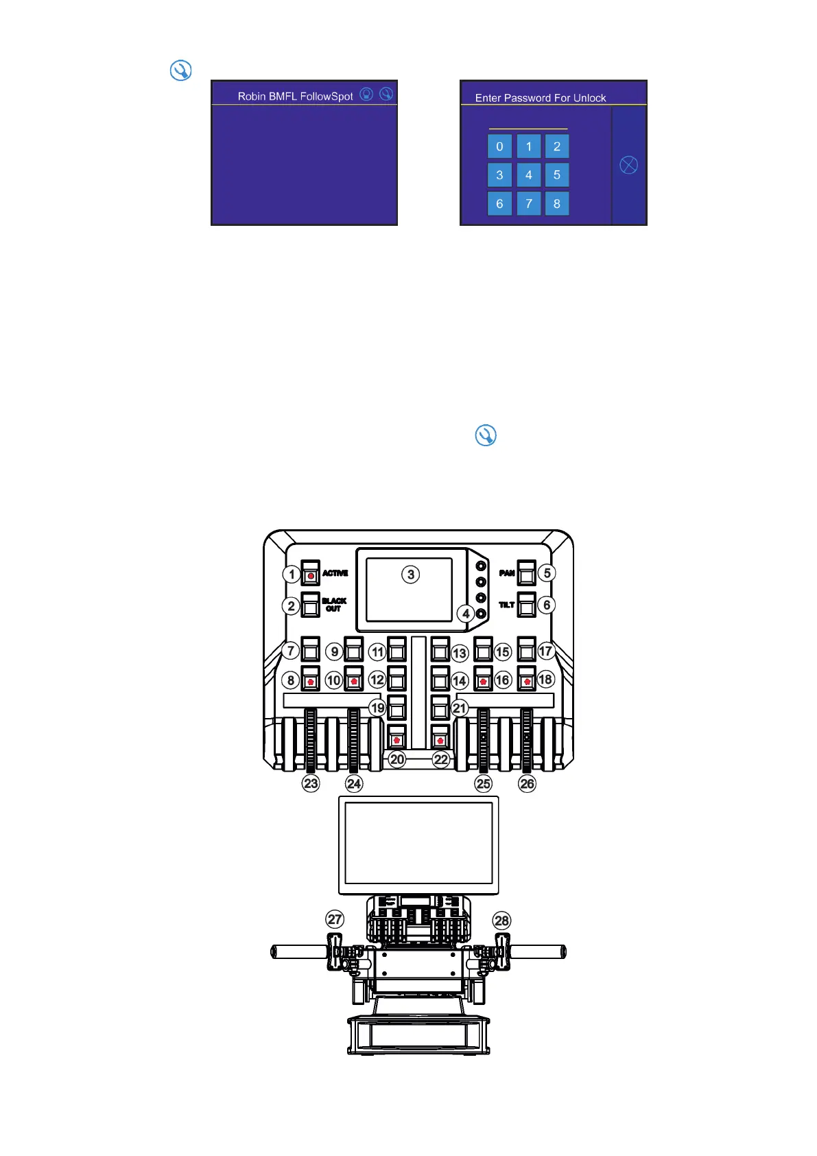 Touch the icon on the FollowSpot Controller to display the password entering screen: