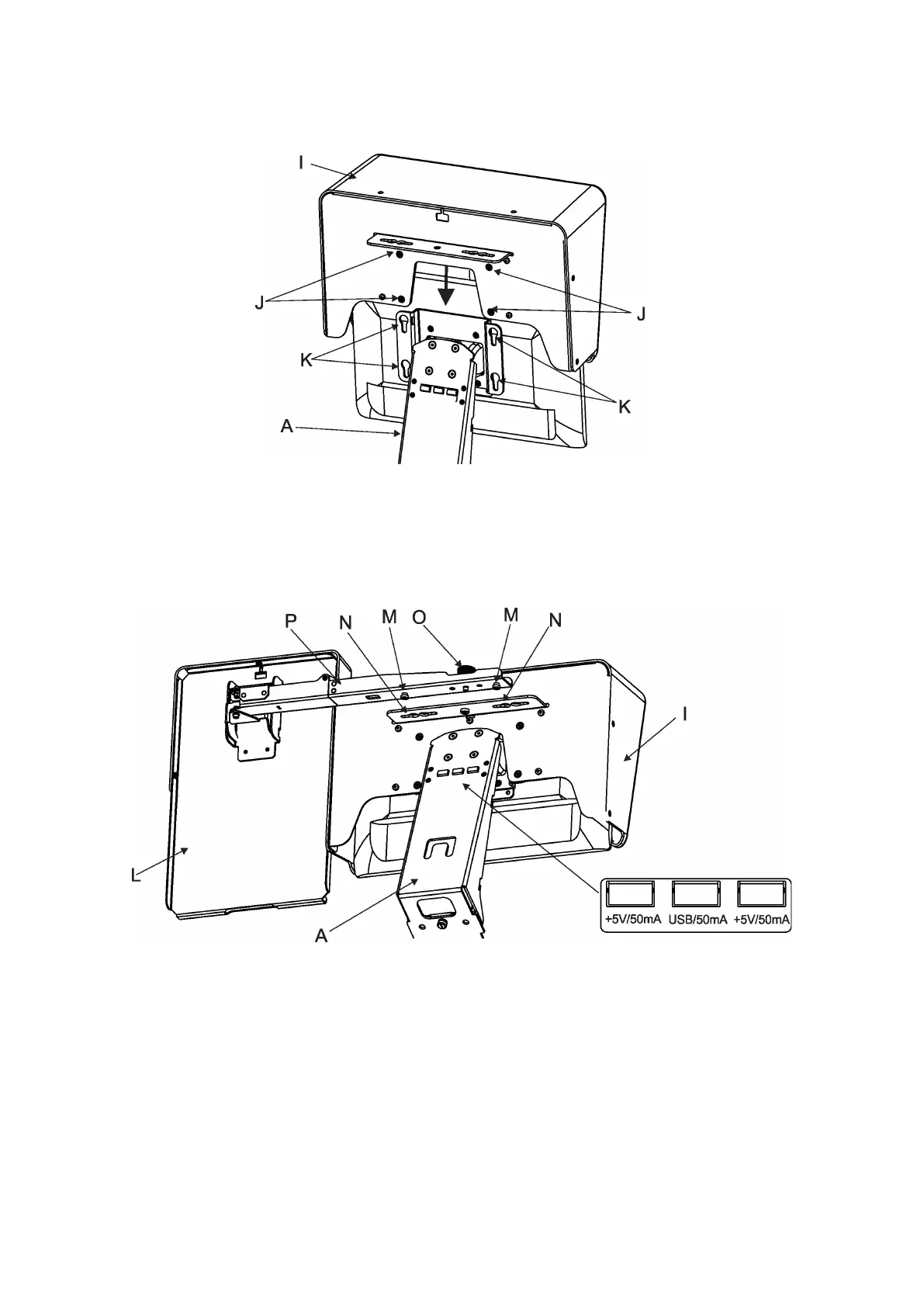 1. Place the monitor shield (I) on the monitor holder (A) in this way that pins (J) of the monitor shield snap to