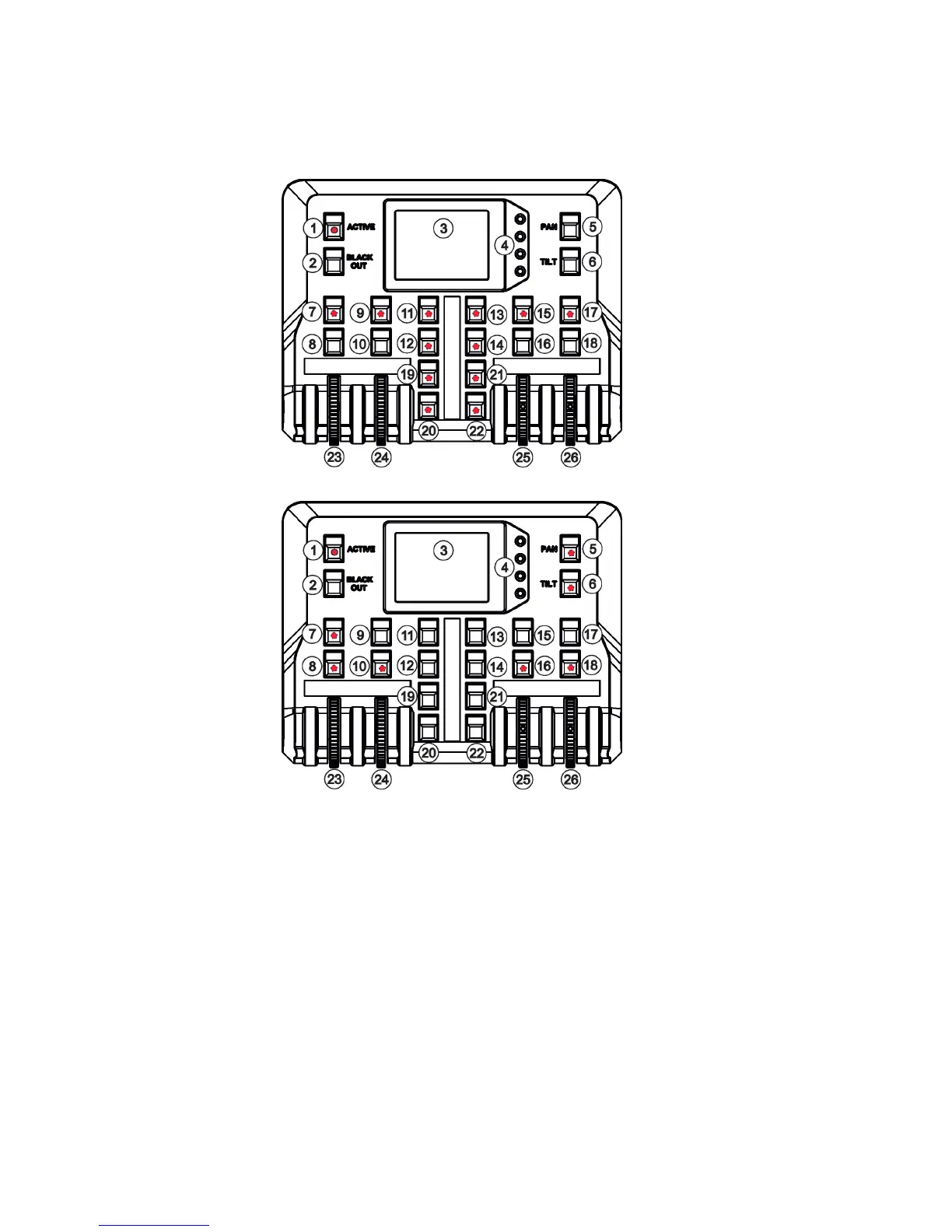 wheel activating buttons (8/10/16/18) and the pan/tilt buttons (5/6) start to ash.