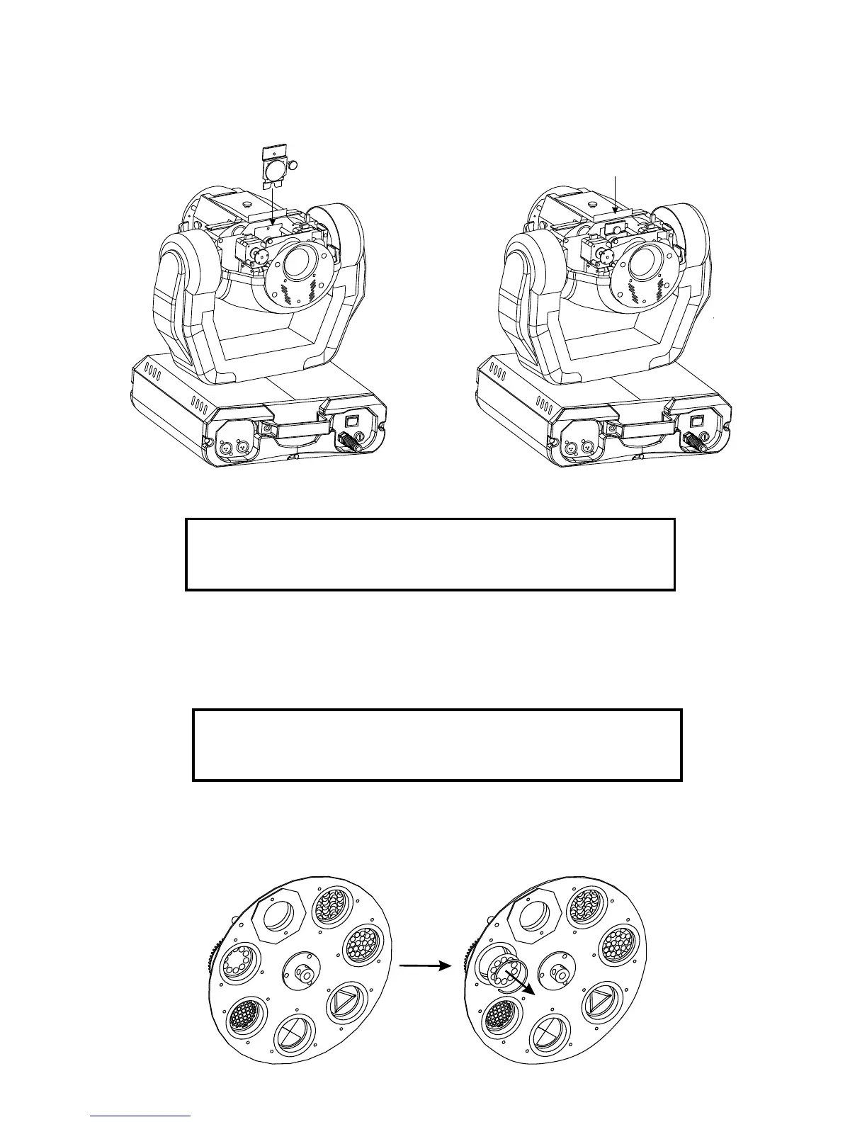 Never unscrew the screws of the rotating gobo
