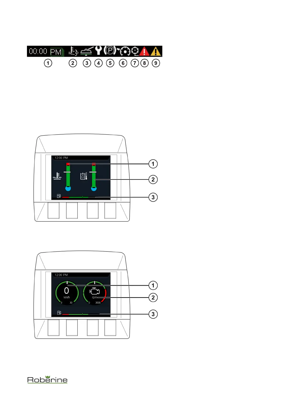 Roberine F302 - Status Bar Icons; Main Display Screens
