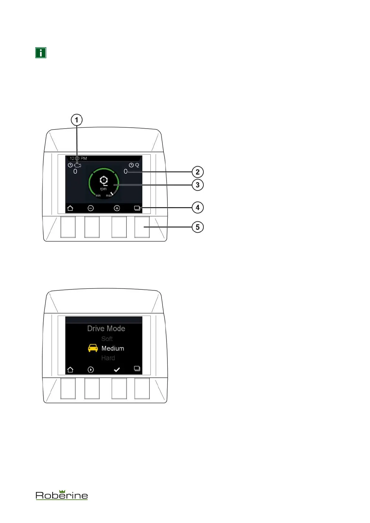 On settings screen 1 the mowing units rpm (R5 only) can be adjusted if needed. Press - to decrease the rpm and + to