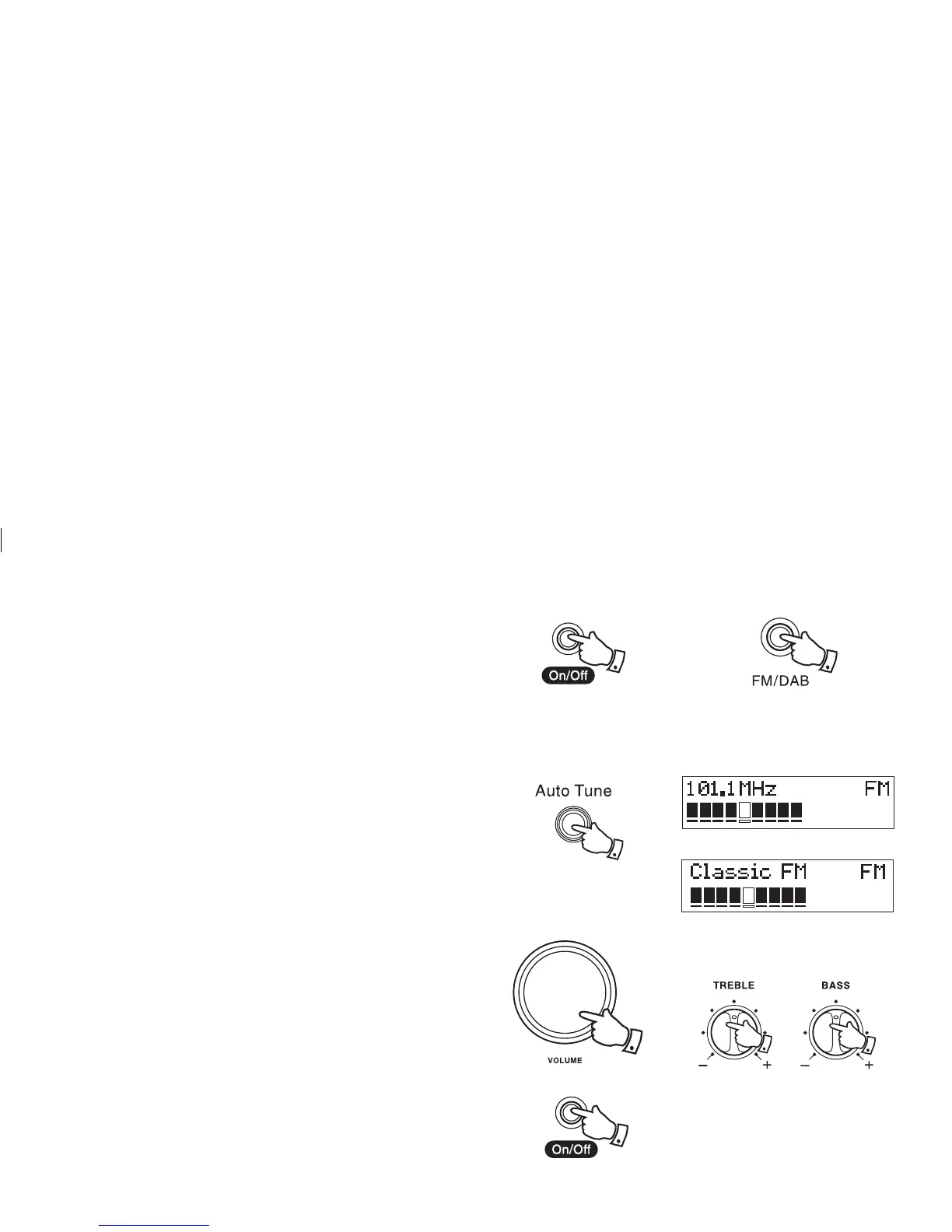 9. Adjust the Volume, treble and bass controls to the required