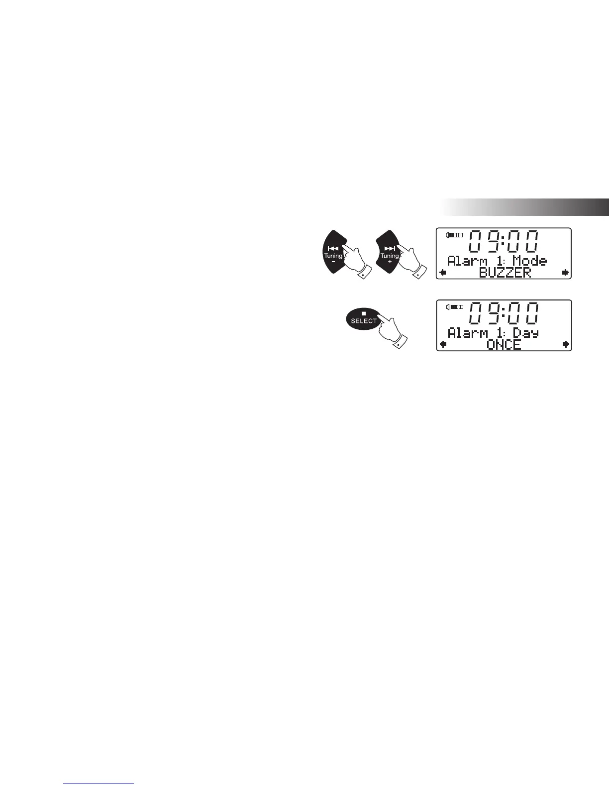 8. Press the Tuning Up or Down buttons to choose the required alarm